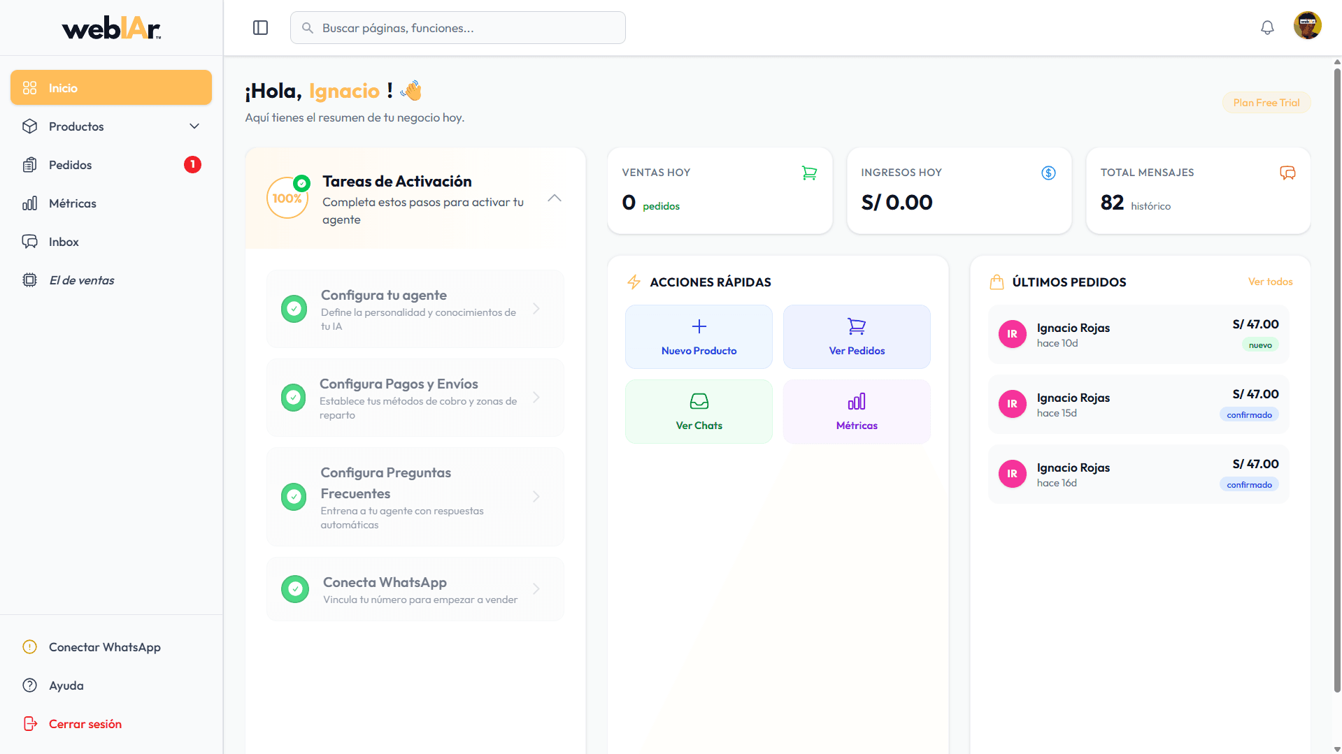 Cuéntale a webIAr cómo hablas, qué vendes y a quién. En minutos, tu agente aprenderá a responder y vender como tú